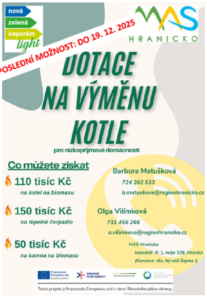MAS Hranicko stále nabízí pomoc žadatelům o dotaci na výměnu kotle (výzva je do 19. 12. 2025) viz. leták.