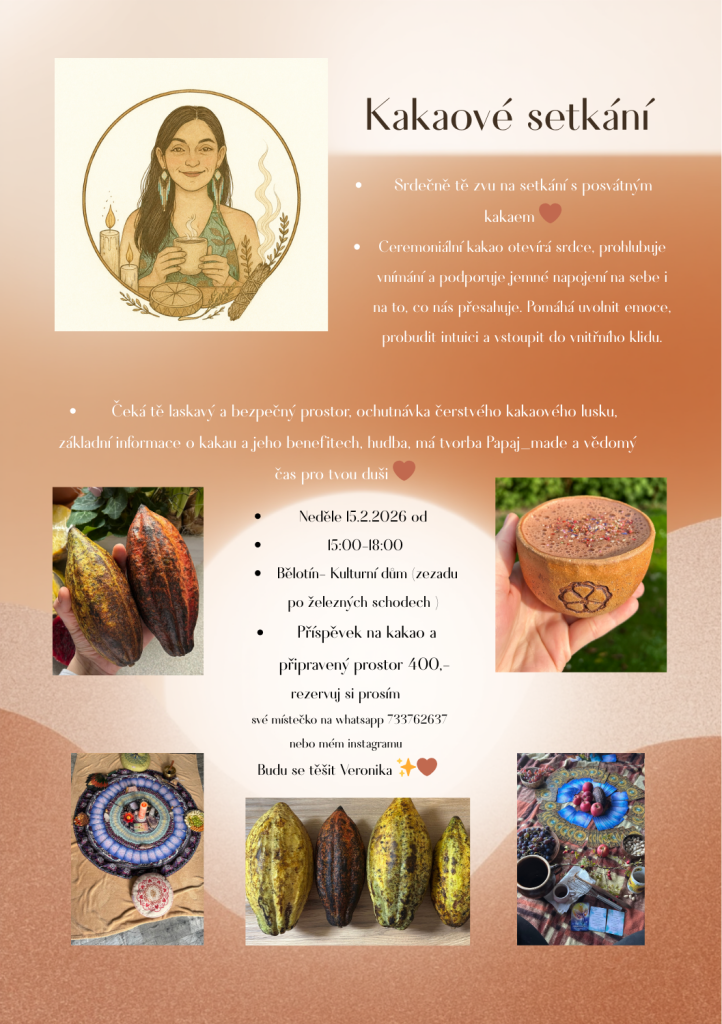 Zveme vás na kakaové setkání, které se koná v neděli 15. února 2026 od 15:00 do 18:00 v kulturním domě v Bělotíně.